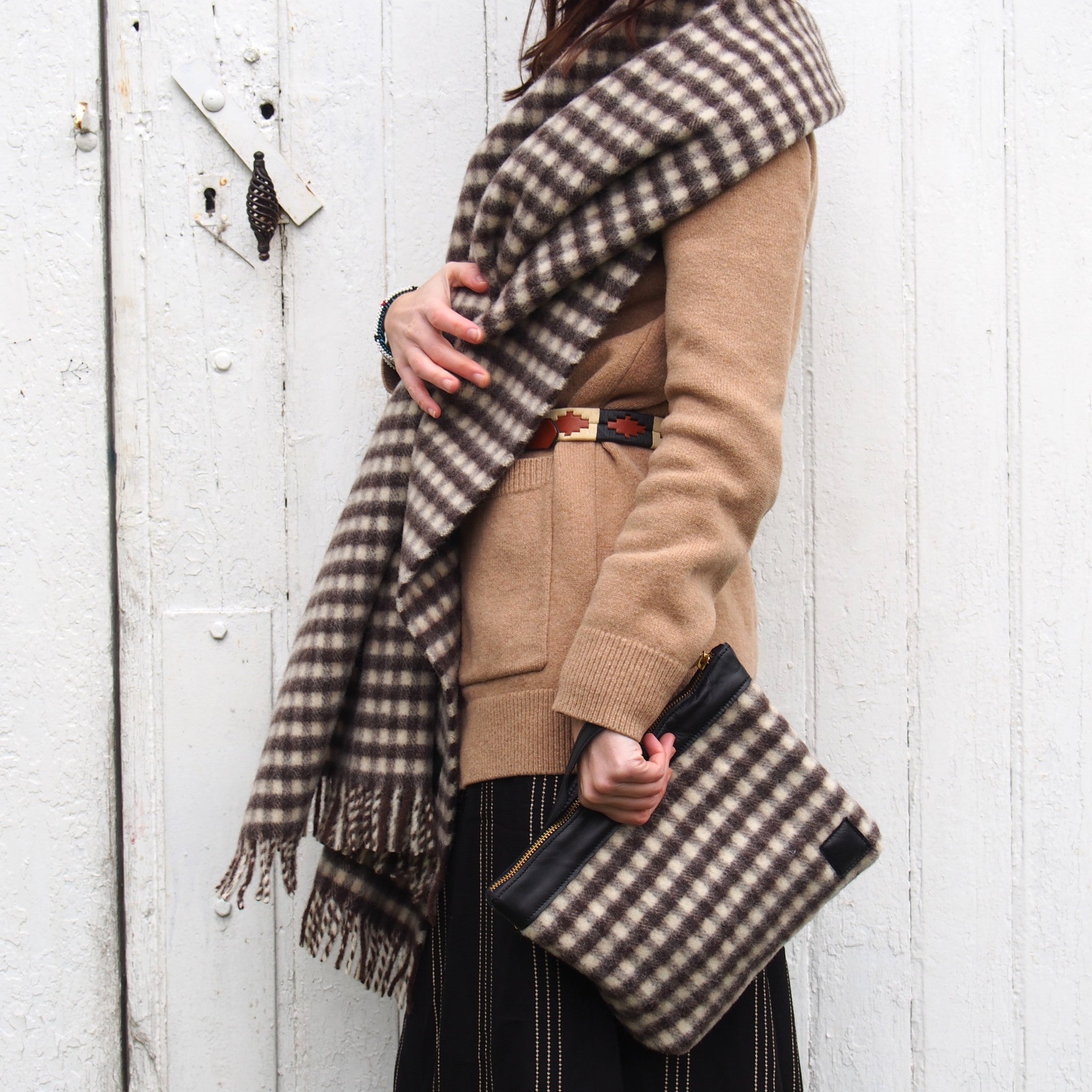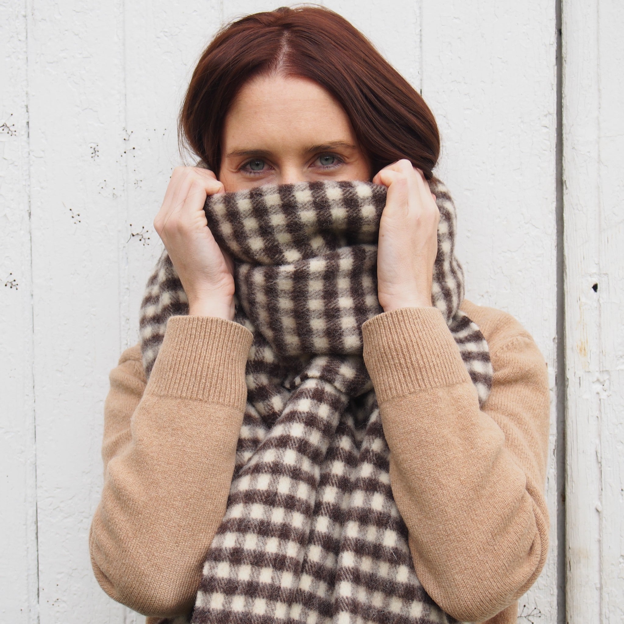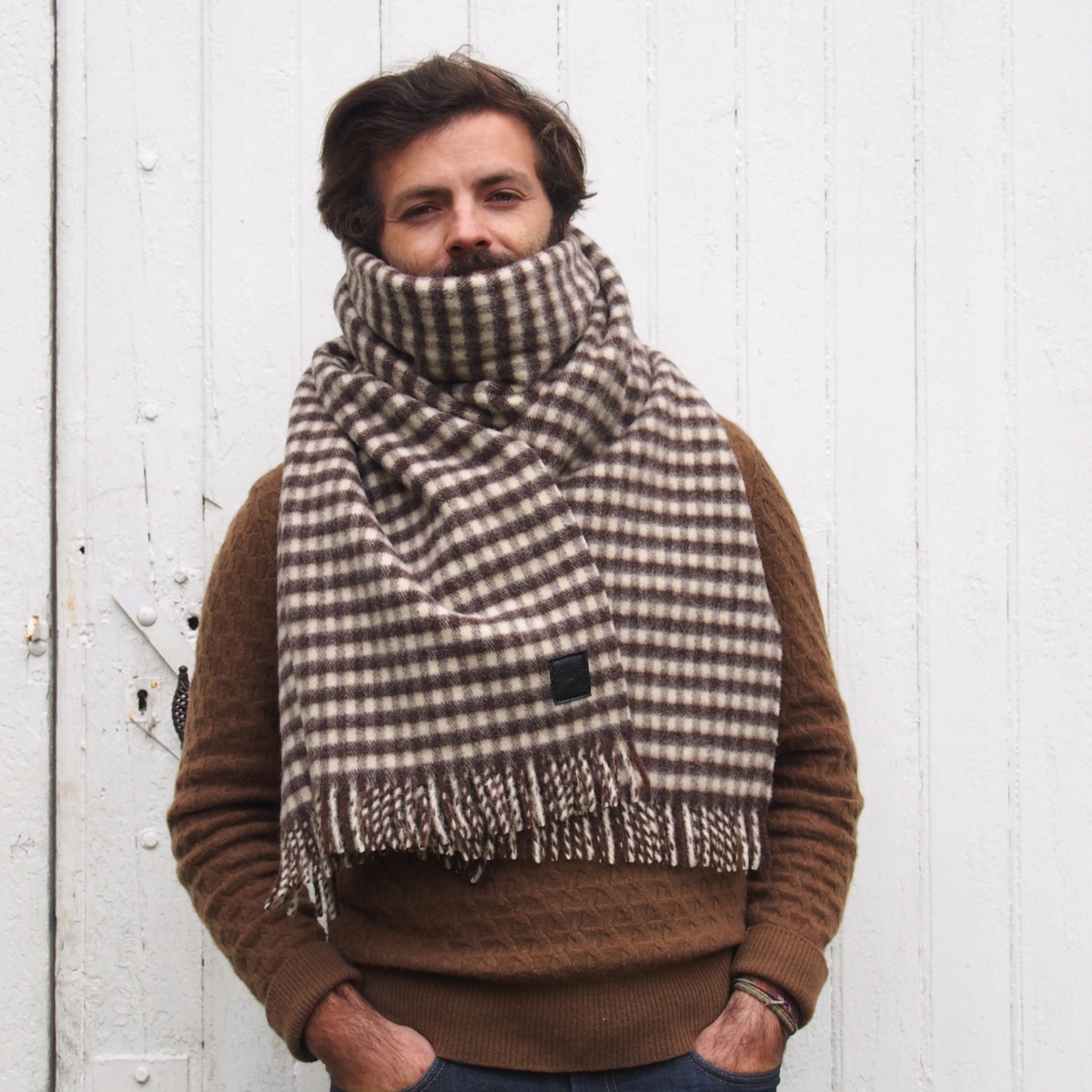 Graphically made in natural colours from virgin wool (no specific treatment of dying of the wool), dark brown and ivory, it will easily match with any outfit. It definitely falls into the “hygge” movement, the design has a scandinavian vibe, hence the name of this mini collection, « Hygge », which evokes a well-being feeling, a private and cosy atmosphere.