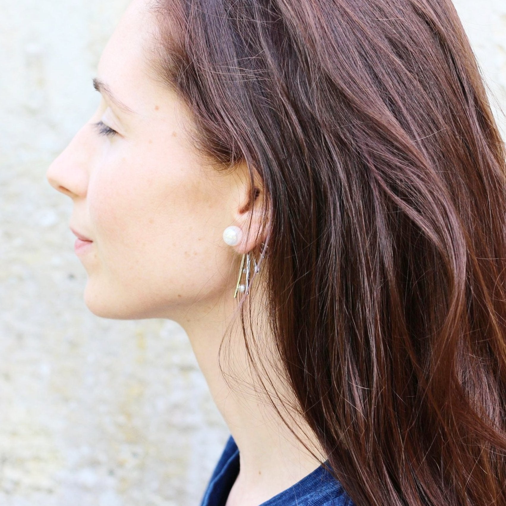 Why not standing out from the crowd wearing a little abstract sculpture like an art object as earring ?!!! The LAMIE brand, only distributed in Japan and Asia so far, was the first brand to be curated for the A BELLULA e-shop. Made all by hand and one by one, each earring is unique and precious. Four freshwater pearls have been left delicately on the structure which evokes a spark.